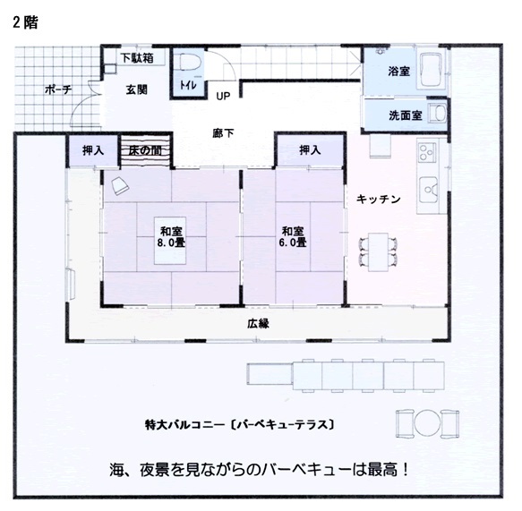 ⑤ そして、2階最大の特大バルコニー(バーベキューテラス)。夏なら眼下に広がる海や夜景を眺めながらのBBQは最高!